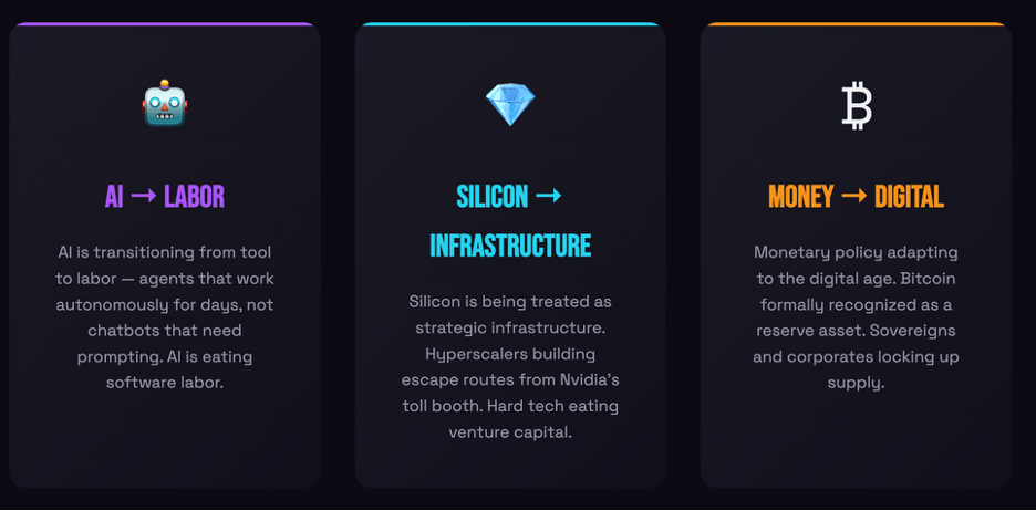 For investors, the message is clear: "software eating the world" has evolved. Now AI is eating software labor, and hard tech—chips, weapons, energy, biology—is eating venture capital. Success in 2026 means navigating a landscape where corporate strategy and national industrial policy are increasingly indistinguishable.